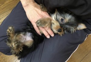 ホールドする部位は「身体の重心」が基本です。通常、重心は心臓の周辺となります。幼いパピーや体重の軽い小型犬であれば、片手で重心を抱えただけで、身体を持ち上げることができる位置になります。